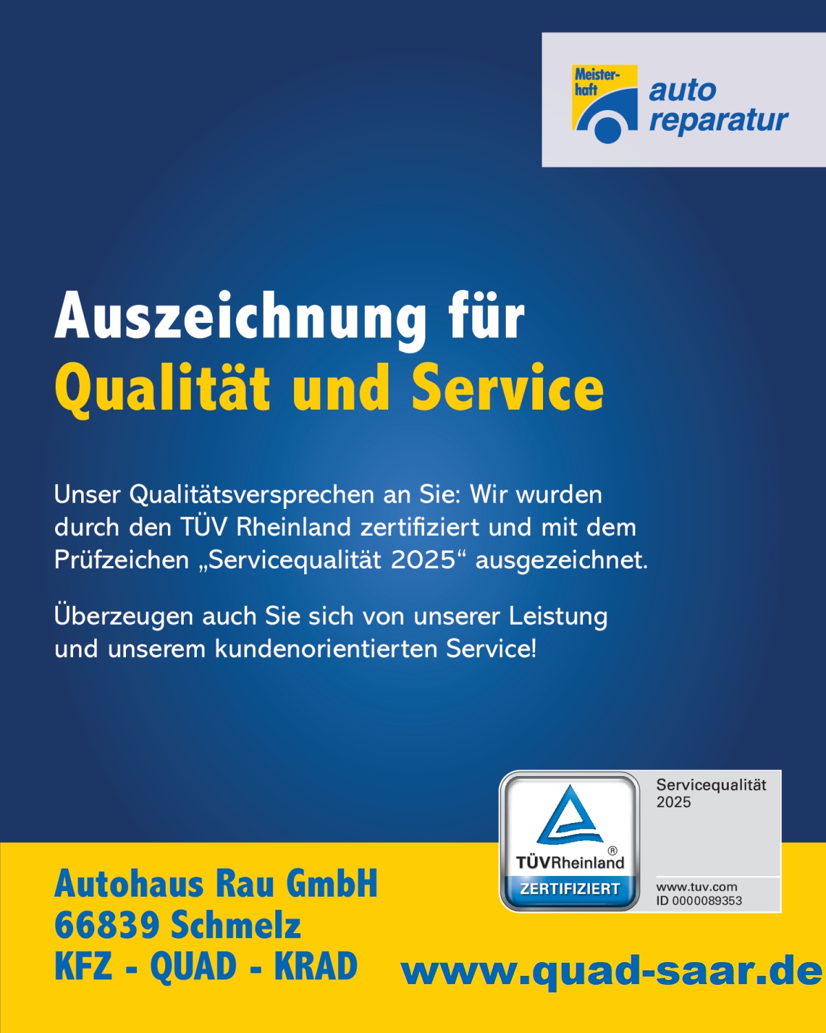 Denn echte Kundentreue entsteht dort, wo perfekte Werkstattqualität auf erstklassigen Service trifft. Genau das beweisen die regelmäßigen, unabhängigen und anonymen TÜV‑SÜD‑Werkstatttests – und das Autohaus Rau hat dabei mit der Note „Sehr Gut“ überzeugt.
